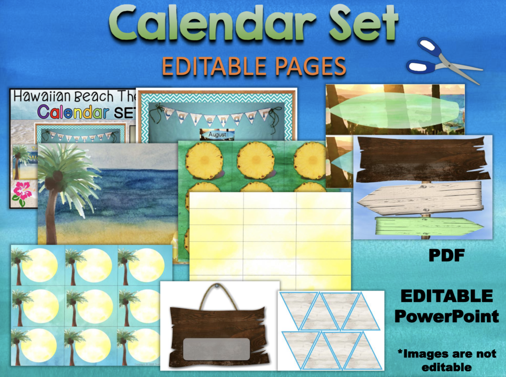 This is a Hawaiian Beach Themed Classroom Decor Editable bundle with pineapples and palm trees! It has 6 Resources bundled using Hawaii photographs and watercolor clip art.
