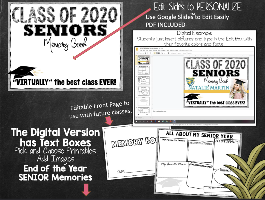 I love this resource because using Google Slides makes it so easy for students to create, no digging around for printed photos or keepsakes, everything can be added digitally. It also makes the perfect senior memory book project for the end of the year!