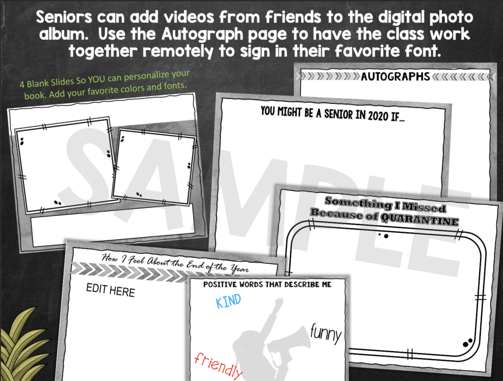 Students who are participating in the digital option will have easy-to-identify text boxes to edit with directions. They can insert images, text, and even videos if they want to save their memories digitally. They can add school colors, and senior pictures, write their feelings about the end of the year, anything they may have missed from being out of school, and so much more! Students can print them out as a keepsake or just keep them digitally.