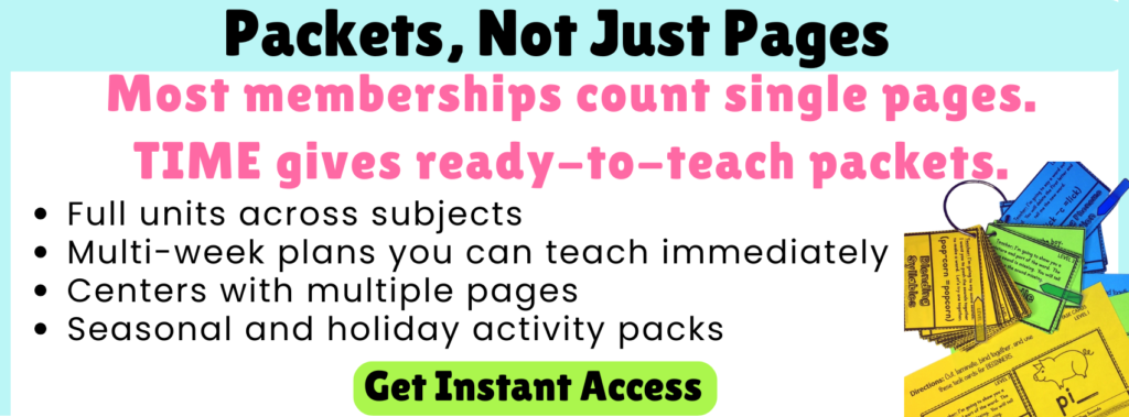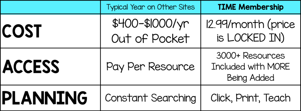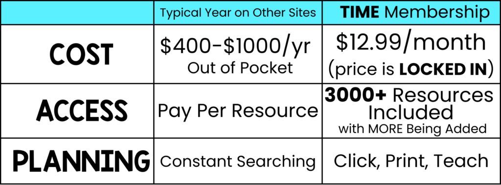 With TIME (Teaching Ideas Made Easy), you get full packets, units for all subject areas, centers, escape room challenges, morning work sets, sub plans, decor, crafts, and holiday packs, all included for a single low, LOCKED-IN monthly price.