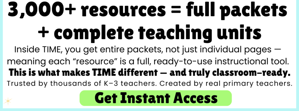 With TIME Teaching Ideas Made Easy, you save hours every week with ready-to-use packets, morning work, behavior tools, centers, early finisher activities, games, and sub plans created by experienced K to 3 teachers. New resources are added every month so your lessons stay fresh without extra planning.
