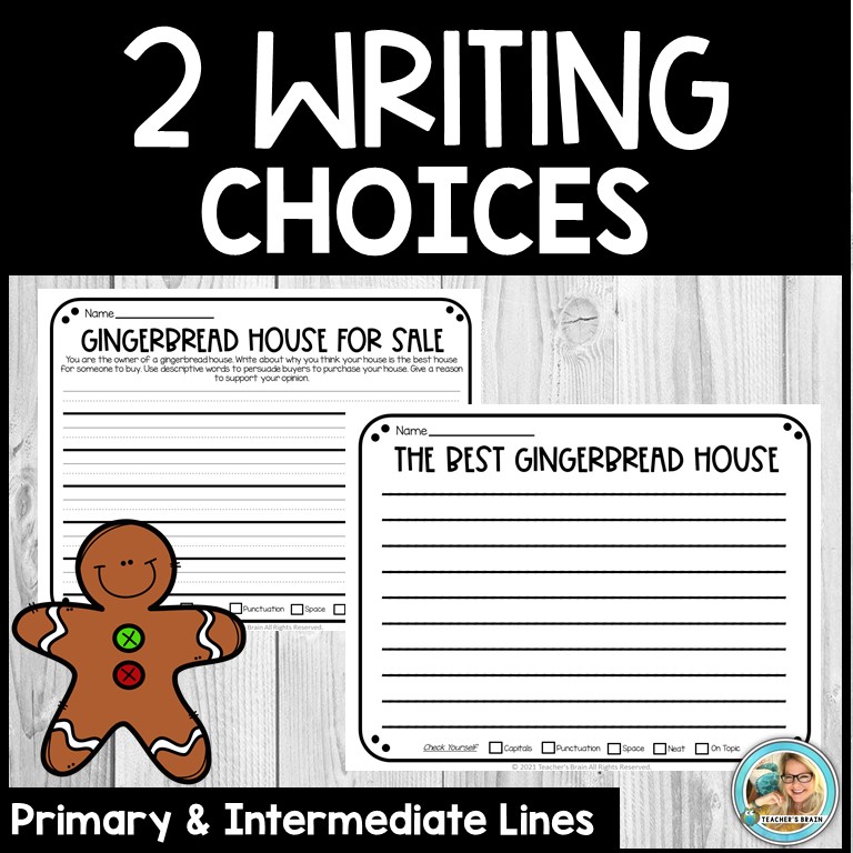- 2 Primary Lined Writing Prompts (House for sale OR Have a contest and write about their favorite colored gingerbread house.)