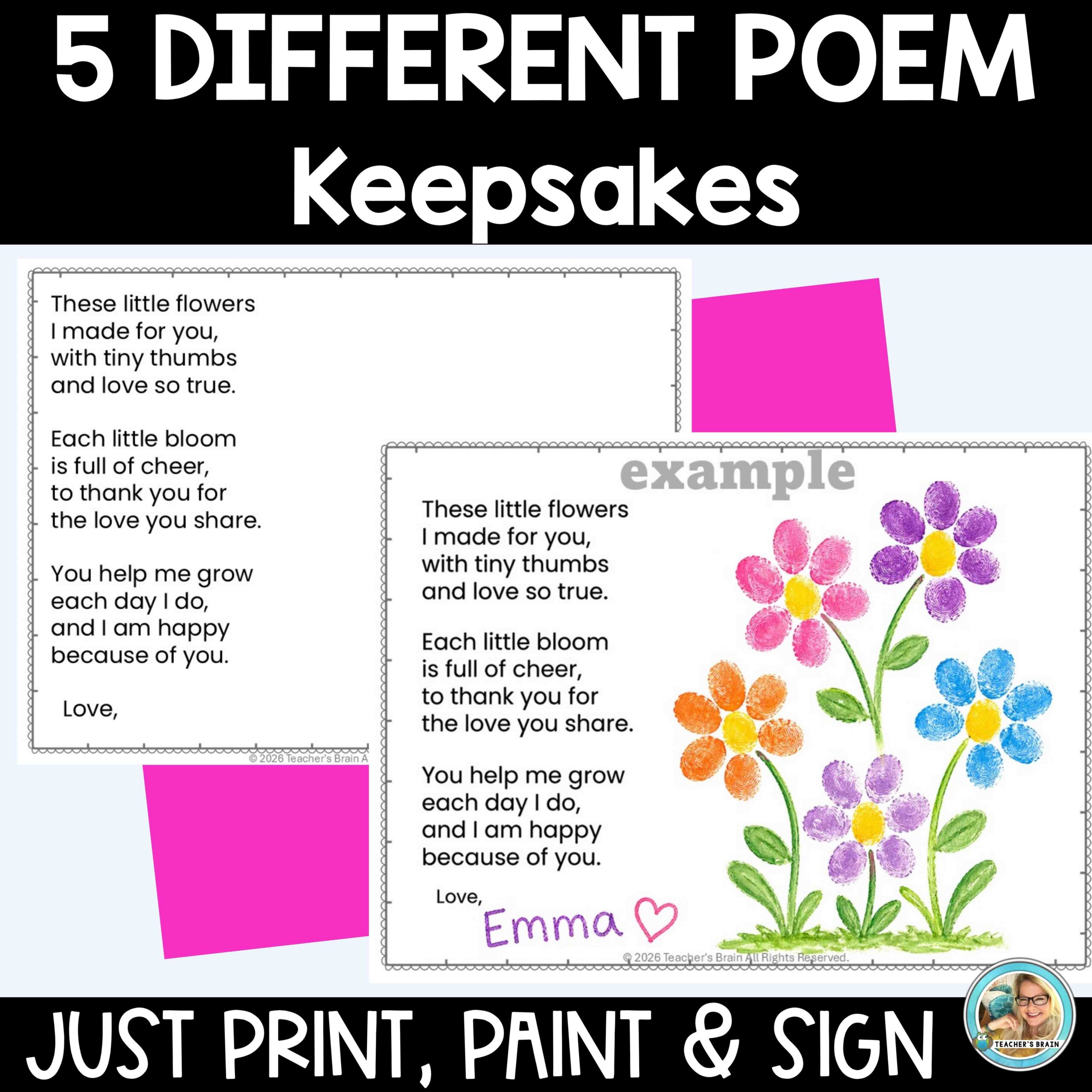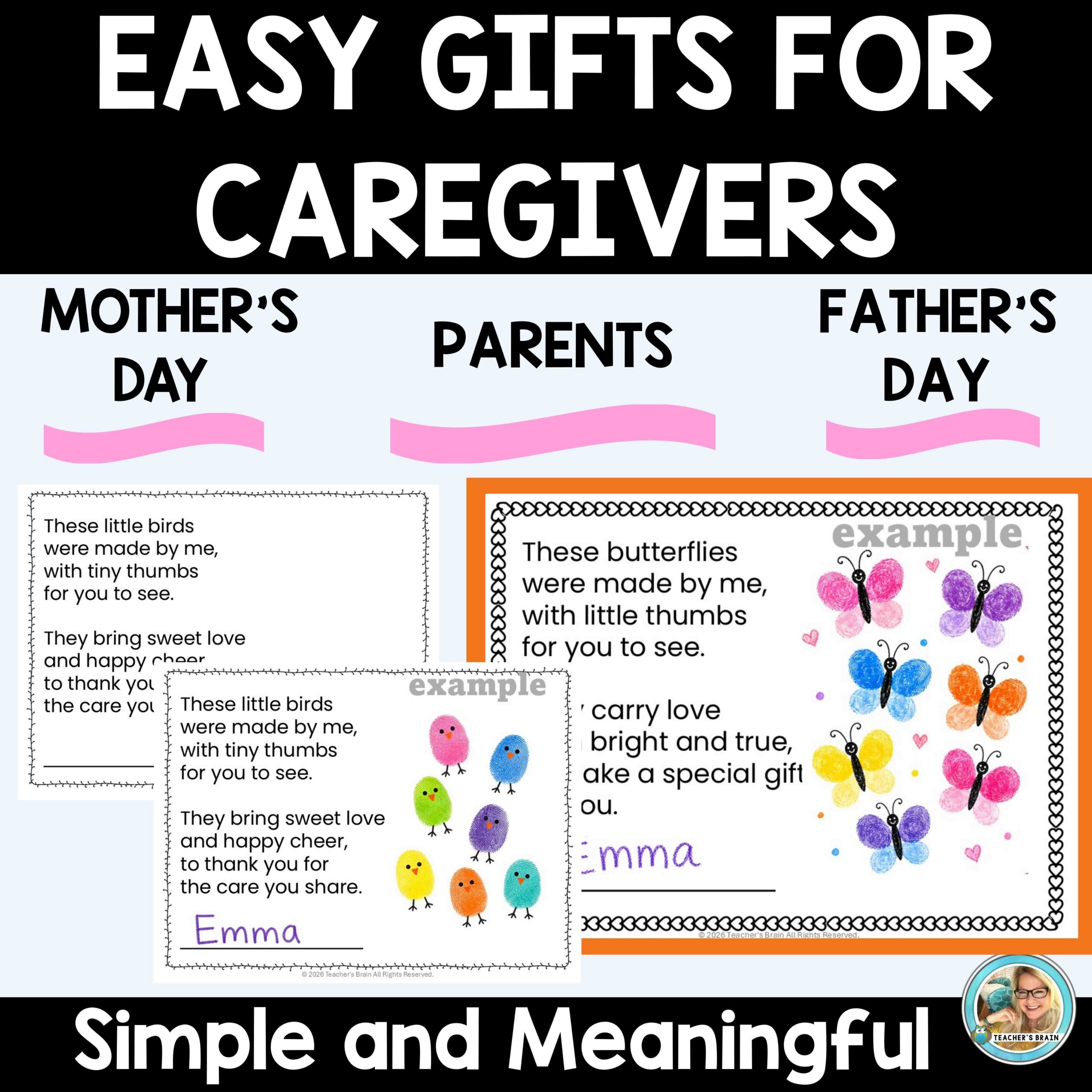 Mother’s Day, Father’s Day, and caregiver gifts are easy with these sweet handprint and thumbprint keepsake crafts! This low prep resource includes printable poem pages that students can personalize with painted handprints, thumbprint flowers, thumbprint butterflies, thumbprint birds, and a sunshine craft.