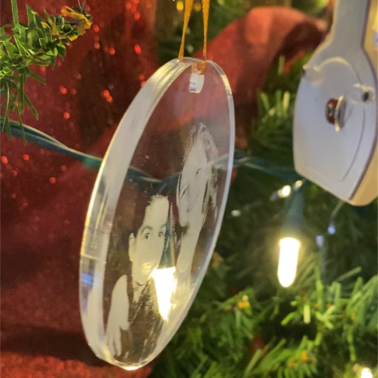 These are made from thick clear, durable acrylic. It includes a ribbon to hang the ornament. Ornaments a circular and 3 inches wide.