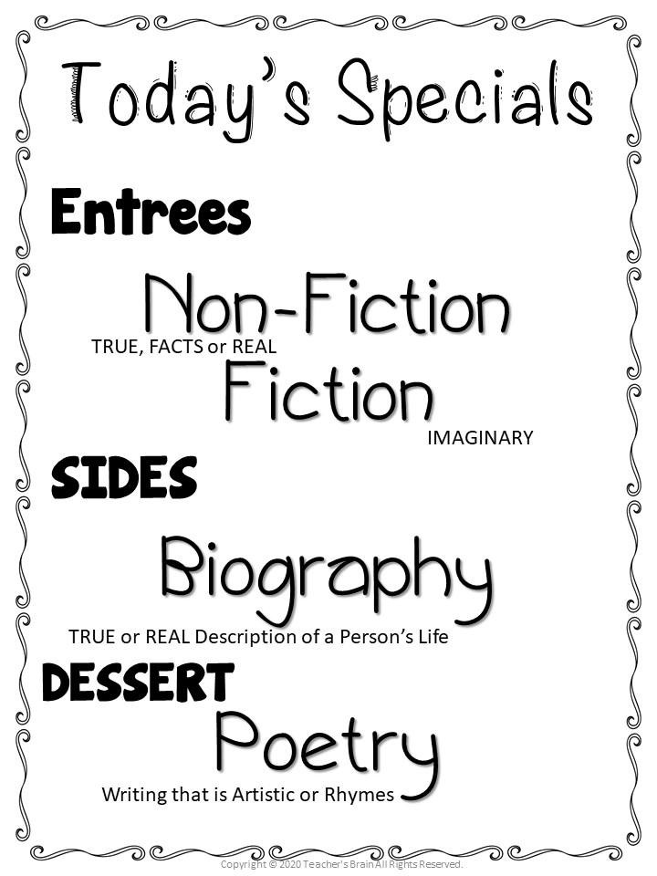 - Pg. 12 -15 Signs and Vocabulary Posters (Students will learn about fiction, non-fiction, biographies, poetry, and federal funds.)