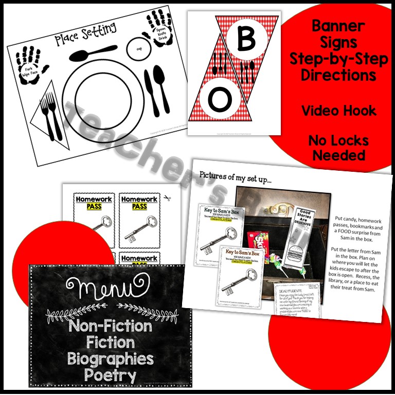There is a PDF file with step-by-step instructions, a link to incorporate a YouTube Video to HOOK your students into accepting a mission to help a store owner have his Grand Opening. It can only be solved by working through some book “tastings” and using teamwork. Opening the box, (no locks needed) leads them to escape the classroom to enjoy recess or a library break outside of the classroom. Ideas are included.