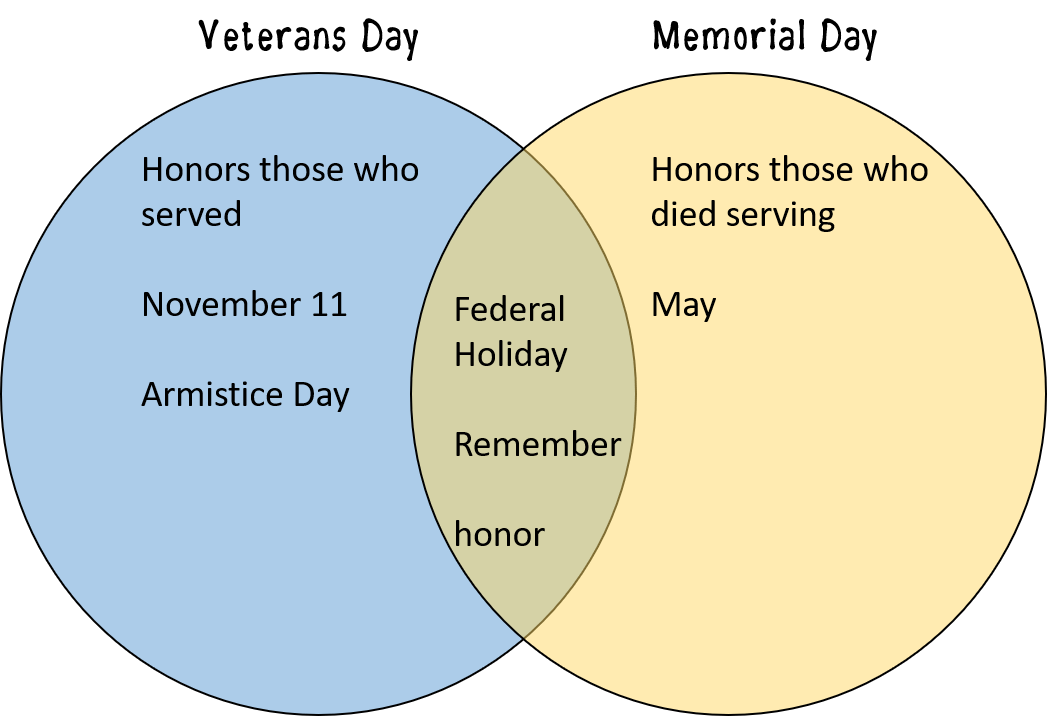Students can make a KWL chart at the beginning of the week to show what they know and what they have learned at the end of the unit. Venn Diagrams make a great way to help students identify the difference of Veteran’s Day and Memorial Day. These two days are confused easily. Memorial Day honors the military personnel who died while serving. Veteran’s Day honors the persons who have served.